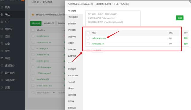 在宝塔面板——网站——设置(站点修改)——域名管理中,可以看到我配置了两个域名(一个Web端,一个Wap端),而在侧栏的SSL中,可以看到这里只允许给单一域名部署证书。